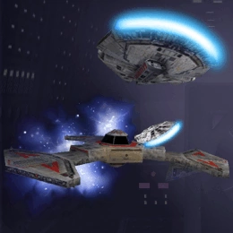 For Ace's first mission behind the controls of a starship, Aeron taught her brother how to properly dock with and carry a cargo container. The Selu and Sabra were to make a trip through hyperspace to the trading platform Harlequin Station, deliver a pair of cargo canisters, and pick up and return a pair of Class-K cargo containers. Both ships deposited their cargo on the station and were moving to pick up the containers for the return trip when two Pursuer-class enforcement ships, the Enkidu and the Gilgam, flying for the Azzameens' rival company, Viraxo Industries, arrived intending to raid Harlequin Station. After the station's hired security vessel, the IPV-1 Kouerd, fled the system, Harlequin Station's director called on the Selu and Sabra for protection, as they were the only craft in the area. The two Azzameen freighters moved to intercept the interlopers and, after a brief dogfight, forced the Pursuer-class ships to leave, much to Harlequin Station's relief. The siblings collected their containers and returned to Azzameen Station without further incident.[1]