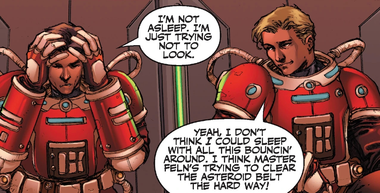 - "Yeah, I don't think I could sleep with all this bouncin' around. I think Master Feln's trying to clear the asteroid belt the hard way!"