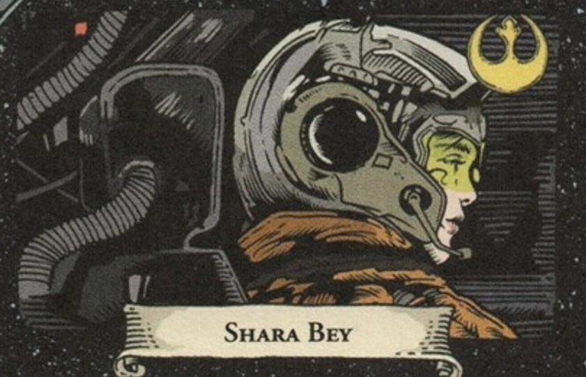 Shara Bey was a human female pilot who served in the Alliance to Restore the Republic during the Galactic Civil War. Lieutenant Bey and her husband, Sergeant Kes Dameron, had a son, Poe, whom they rarely saw during the war—a war they joined because they believed the galaxy was suffering under the rule of the Galactic Empire. Bey, a highly decorated A-wing pilot and a veteran of numerous battles, flew with Green Squadron in the assault against the second Death Star during the Battle of Endor.