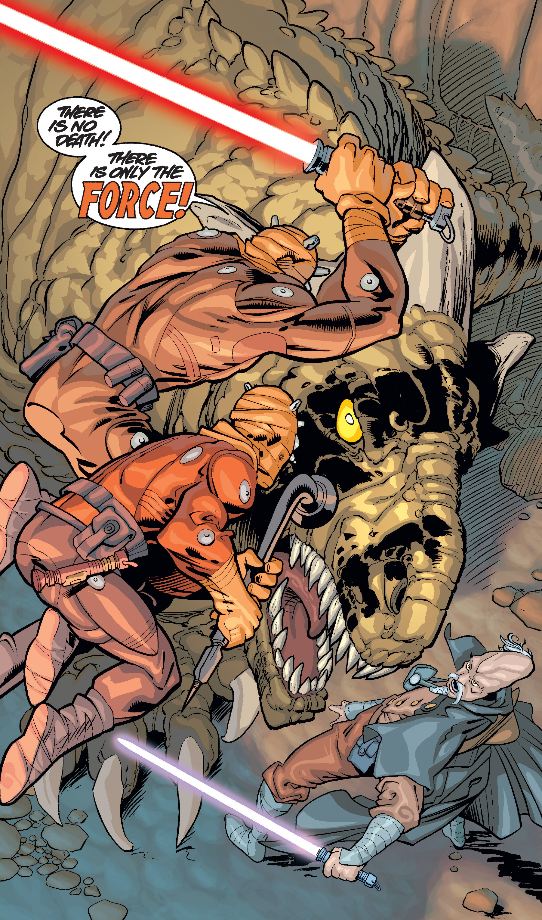 Hett, his son and Ki-Adi-Mundi battle a canyon krayt dragon.