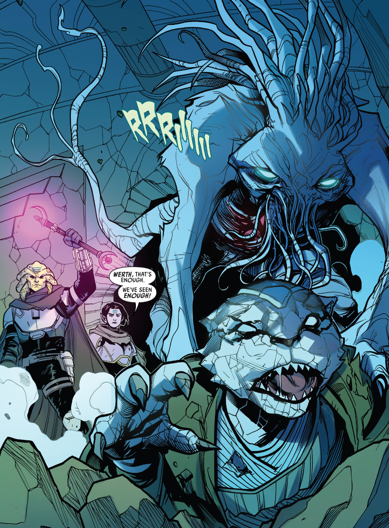 As three Nihil agents—the technicians Cale, Werrera, and Leyel—snuck aboard and sabotaged Starlight's systems, the seven Nameless they kept aboard their freighter, logged as Rathtars to keep their existence hidden, left the Jedi on Starlight on edge and unable to sense the sabotage. As the station began to break apart, the Nameless broke free from the ship[3] and began a rampage throughout Starlight,[29] killing a number of Jedi, including Orla Jareni.[3] Meanwhile, the Republic launched an attack on a Nihil convoy that, unknown to them, was carrying more Nameless[30] to Starlight,[2] so Caphtor was left in a state of shock when a mere peephole was opened on one of the crates.[30] Arriving to Starlight amid the destruction, Uttersond told him and Holt about the Nameless before they boarded, handing over ripped pages that[2] once belonged to Rell's journal.[21] As Uttersond escaped, they encountered a Nameless, which Holt needed to describe to her Jedi partner as he was unable to truly see it.[2]