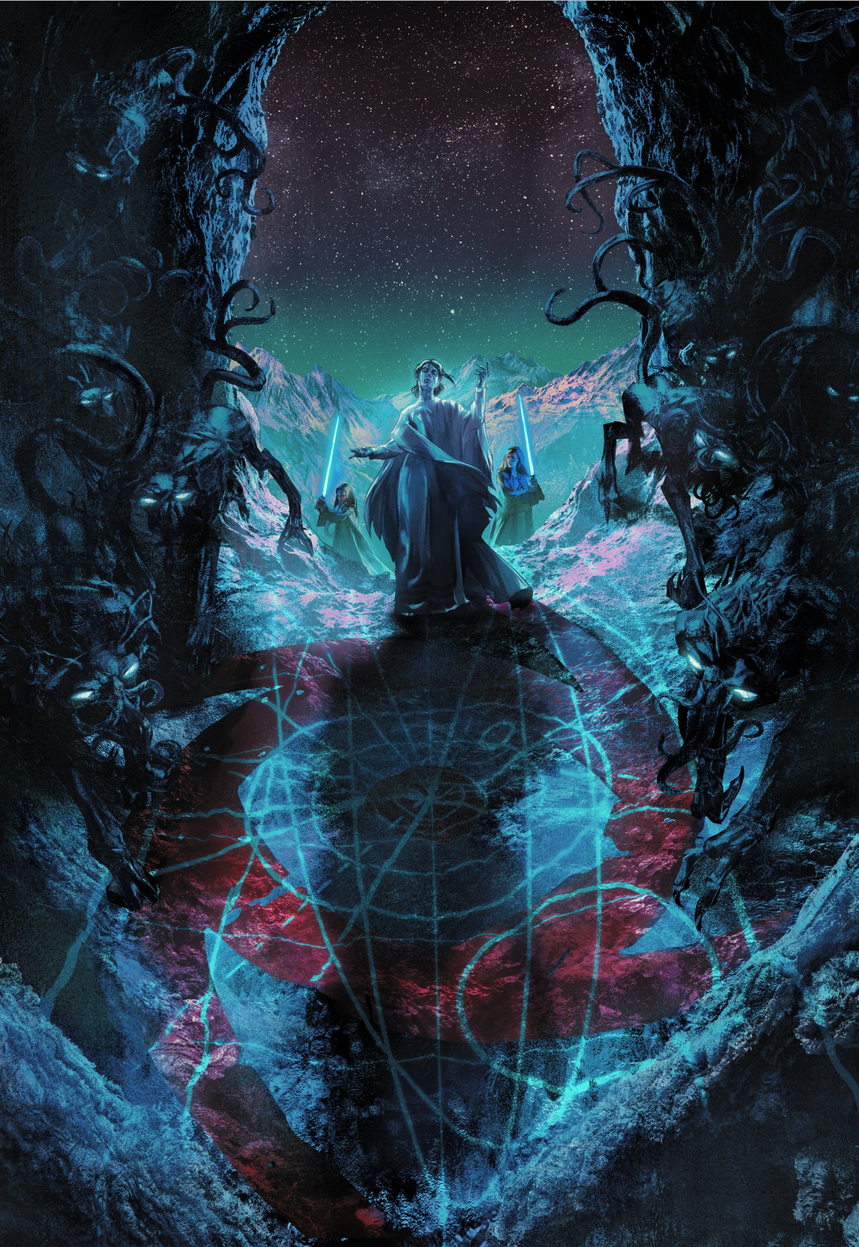 By the time of the High Republic Era, the creatures had become known to some as the Nameless and to others as the Shrii-ka-rai, or Eaters of the Force.[2] The Ros, a family of Evereni, had a history of conflict with the Jedi Order, but their fate in that conflict came about due to both the Jedi and an artifact,[11][12] the Rod of Seasons,[5] that controlled the Nameless. Their family was associated with one of the creatures, which the "faithful" revered as the Great Leveler, unaware of its true name.[6][2] Then known simply as the Leveler, the connection between Ros and the Nameless began when the smuggler Radicaz Dobbs gave what, unknown to him, was the egg containing the being to Elecia Zeveron, who led the Path of the Open Hand cult on the planet Dalna as "the Mother"[5] but in secret actively used the Force and only cared for her own power.[7] Ro cousins Marda Ro and Yana Ro were part of the cult, which believed anyone, including the Jedi, using the Force was dangerous. According to what she claimed, Zeveron had received a Force vision of the being that revealed its name to be "the Leveler."[5]