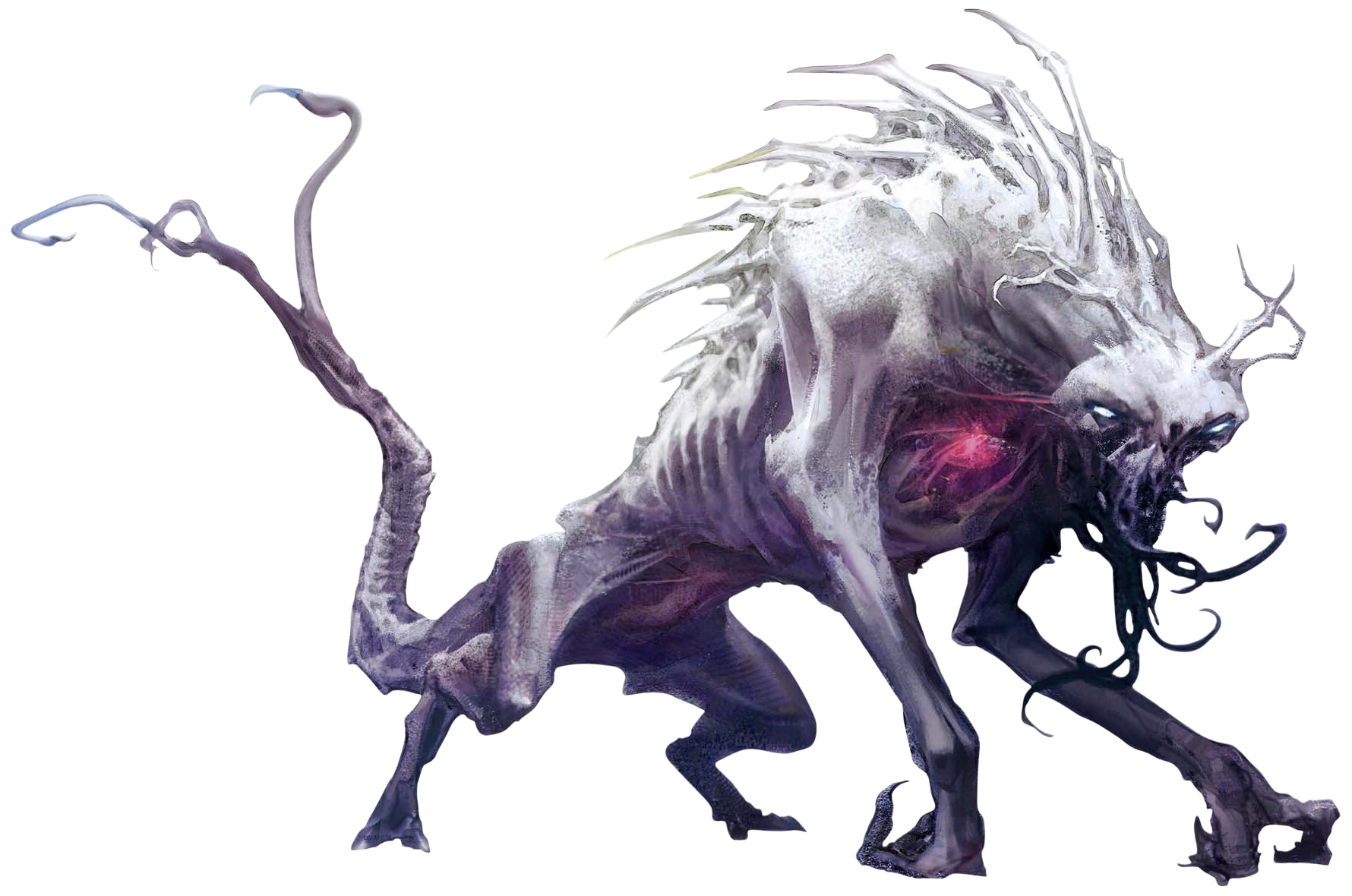 The Nameless started out life as small sludge-like beings, but, through feeding, would quickly grow into bigger forms. As they grew,[5] the Nameless could become larger than humanoids,[3] possessing four legs and claws.[6] The beings' front limbs, which featured three claws, were long and desiccated, twitching slightly as they moved. They possessed sharp teeth and had tentacles around their mouth. Their skin was pale white and their face featured large red eyes. The creatures' blood was black in color.[2]