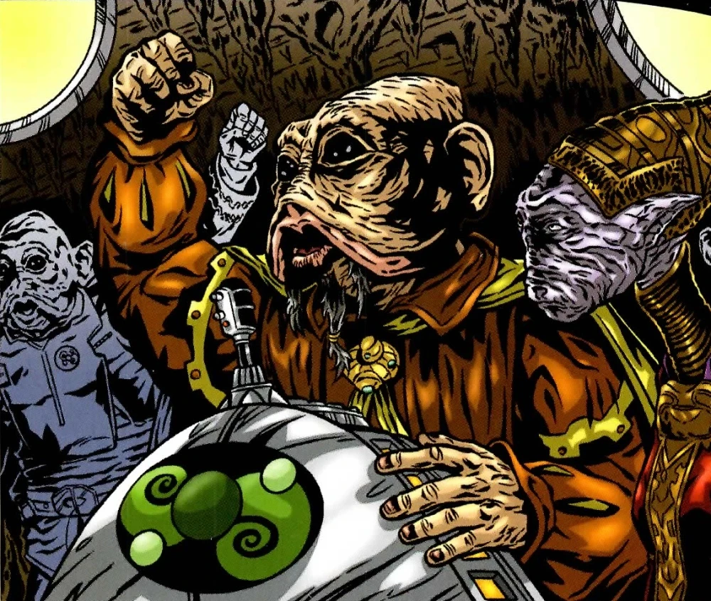 In 22 BBY, Shu Mai, as the Commerce Guild Presidente, was approached by Count Dooku of Serenno, a former Jedi who was the leader (at least to the public) of a group of systems that had defected from the Republic known as the Confederacy of Independent Systems. Mai refused to make a formal alliance with the Confederacy, knowing it would be frowned upon by many of her supporters, though she did make an informal agreement with Dooku.[4] She eventually learned of Darth Sidious, Dooku's mysterious Sith Master, and his plans for taking over the Republic.[12] Mai was not the only one approached: Nute Gunray of the Trade Federation, former senators Po Nudo and Tikkes, San Hill of the InterGalactic Banking Clan, Wat Tambor of the Techno Union, as well as Archduke Poggle the Lesser and many others were contacted by Dooku.[13] Each of them was given a specialized Xi Char mechno-chair, which Sidious and Dooku used to contact them.[12]