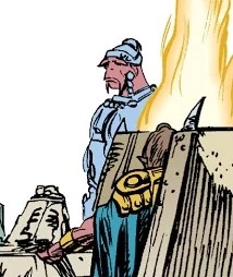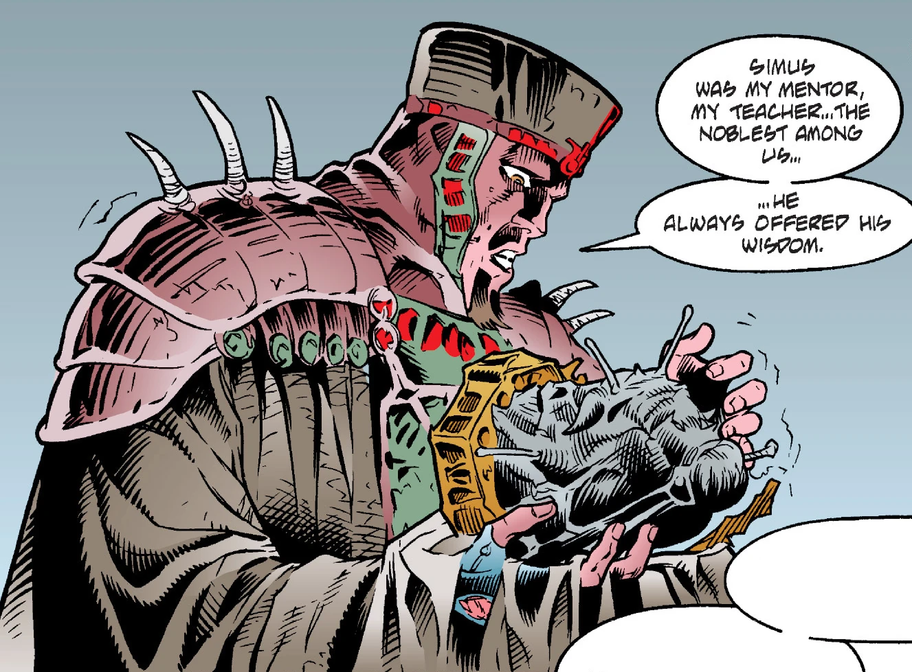 Simus was first depicted in a preliminary sketch done by Dario Carrasco, Jr.[19] that was published in July 31, 1996,[20] in the prologue issue of the Golden Age of the Sith series. Unlike the character's finalized appearance in The Fabric of an Empire, Simus is depicted without a container around his head.[19]