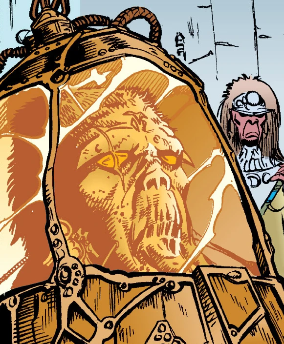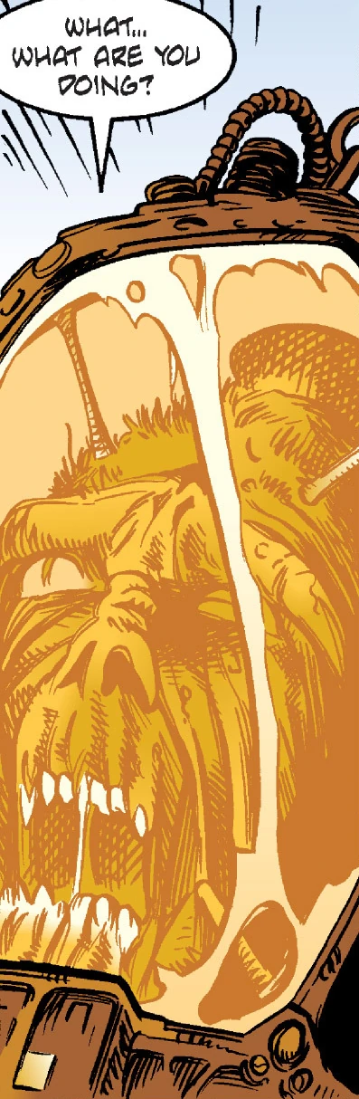 The resulting duel between Marka Ragnos and Simus left the latter scarred and bodiless. However, as remembered over a century later by his apprentice, Naga Sadow, Lord Simus was determined not to fail the Sith.[3] Using Sith techniques unknown to others, the magician kept himself alive, preserving his head in a crystal sphere.[5] An armored Sith served as the bearer of Simus' device, ferrying it as his beheaded master willed.[3]