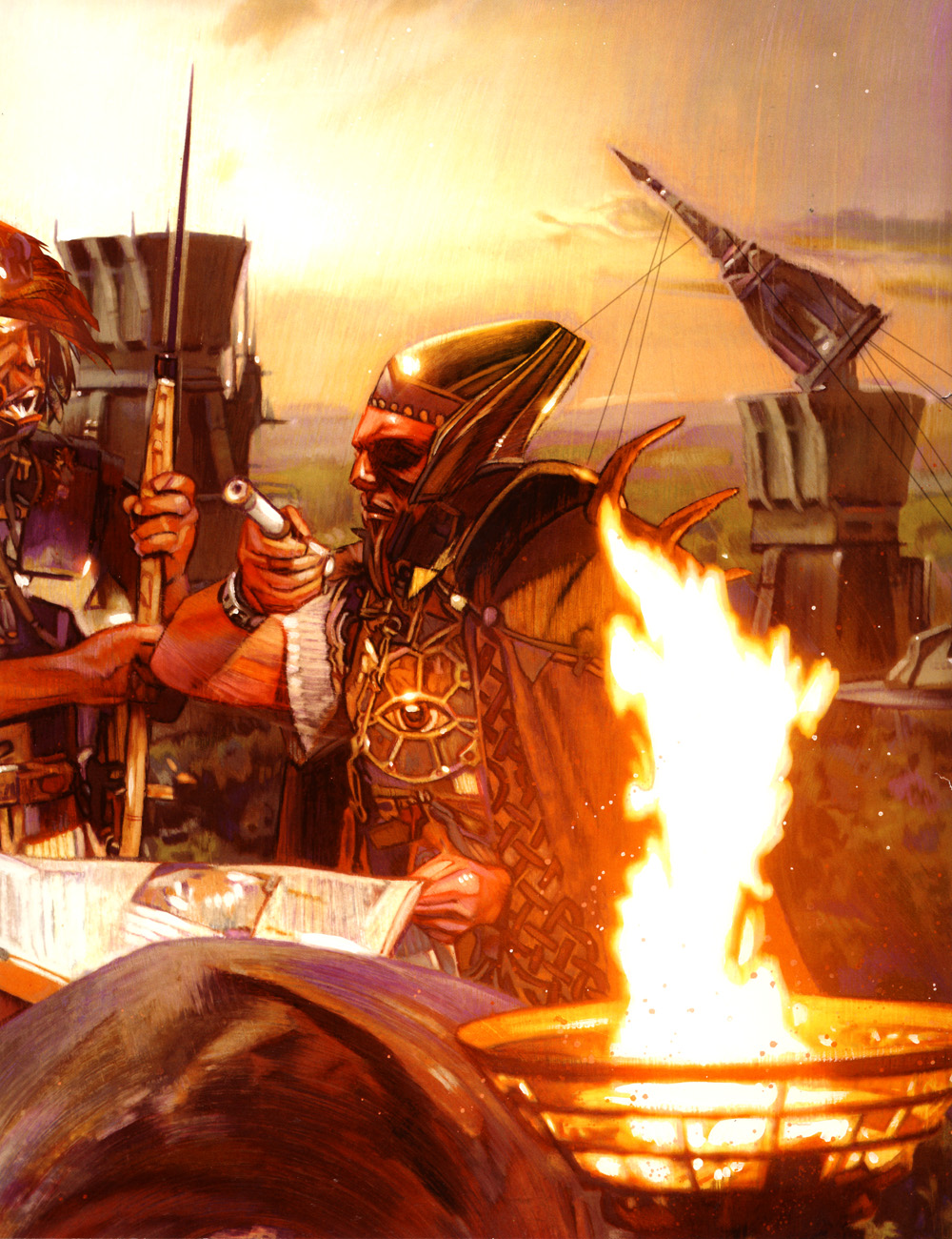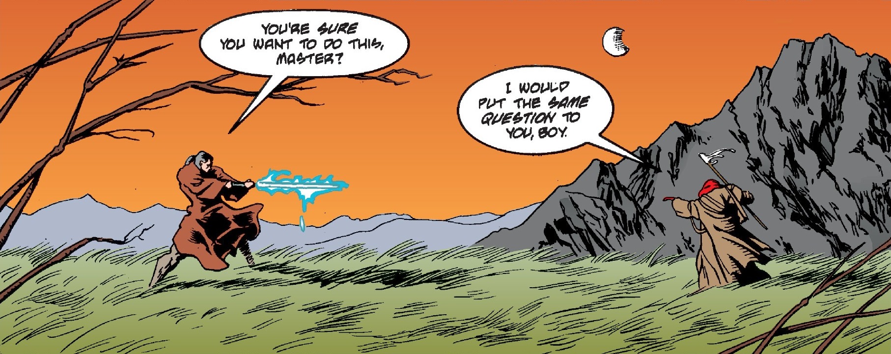 Exar Kun and Vodo-Siosk Baas prepare for a training duel on the plains of Dantooine.