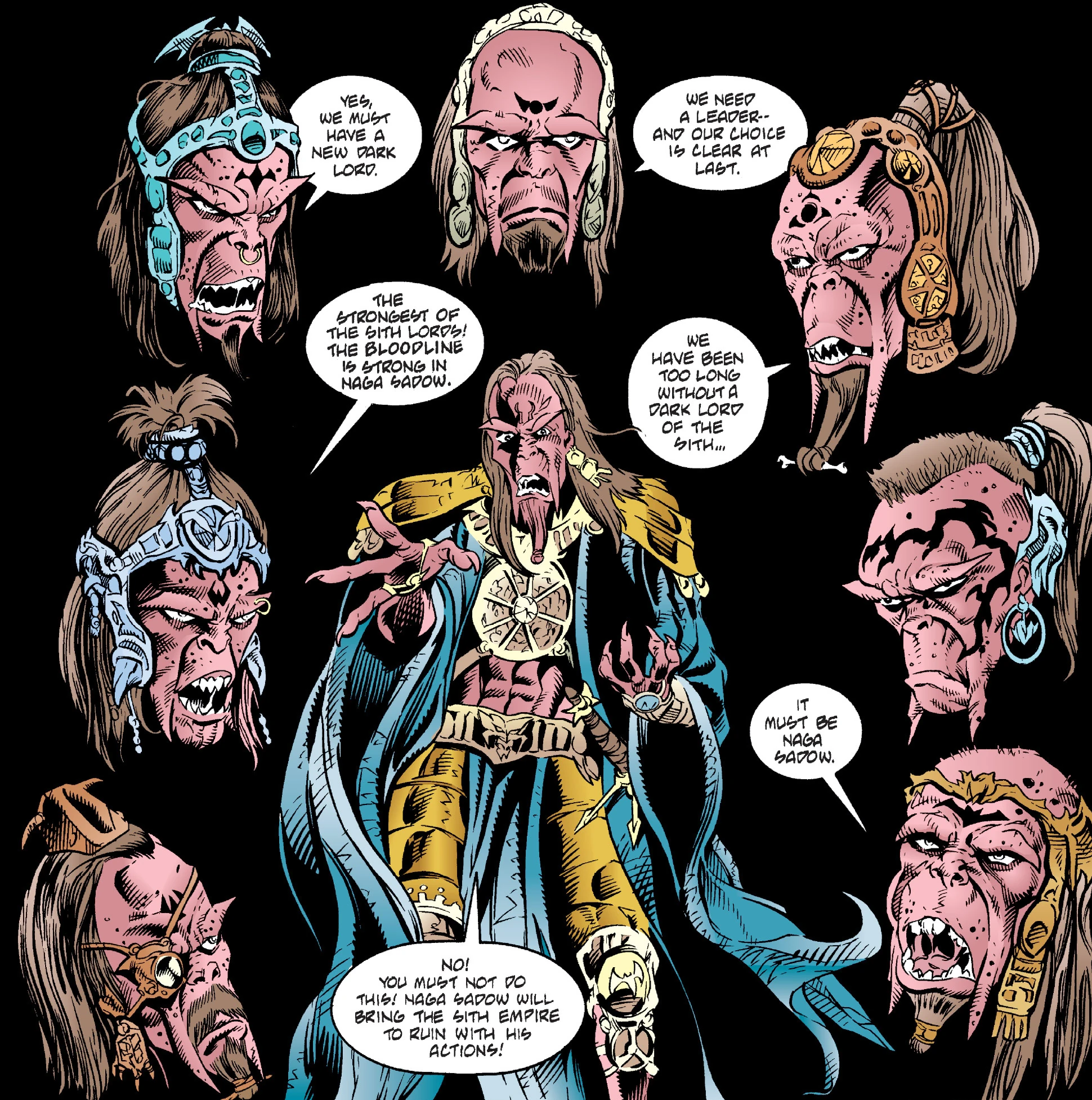 Naga Sadow, Ludo Kressh, Simus, Dor Gal-ram, and Horak-mul were five of the ten Sith Lords on the Council under Marka Ragnos. After Ragnos's death, two Lords on the council, Naga Sadow and Ludo Kressh, fought over the position of Dark Lord of the Sith. This conflict created a rift within the council, with several lords siding with Kressh, and the rest siding with Sadow.[1]