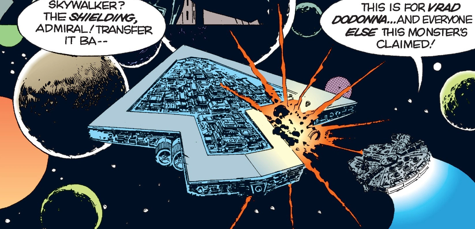 This skirmish took place in the Feswe Corridor, immediately following an initial attack at Skorrupon by the Alliance to Restore the Republic that failed to stop the advance of the newly-completed Star Dreadnought Executor as it neared the Rebel base on Yavin 4. Alliance pilots Vrad Dodonna and Luke Skywalker were assigned to use the shield-negating effects of a power gem to disrupt the Executor's shields and inflict enough damage to stop the Super Star Destroyer's approach. Dodonna, disillusioned with the Rebel Alliance after the first failed attack, instead hoped to sabotage the mission to bargain for his own life with the Empire. After ditching Skywalker on a nearby planetoid, he eventually had a change of heart and rammed his craft into the Executor, killing himself, but failing to knock out the Executor's shields, which had been switched to double-front. The shielding setting, however, left the Executor's aft section exposed, allowing Han Solo and Skywalker in the Millennium Falcon a clear shot that disabled the Super Star Destroyer's gyro-control system.