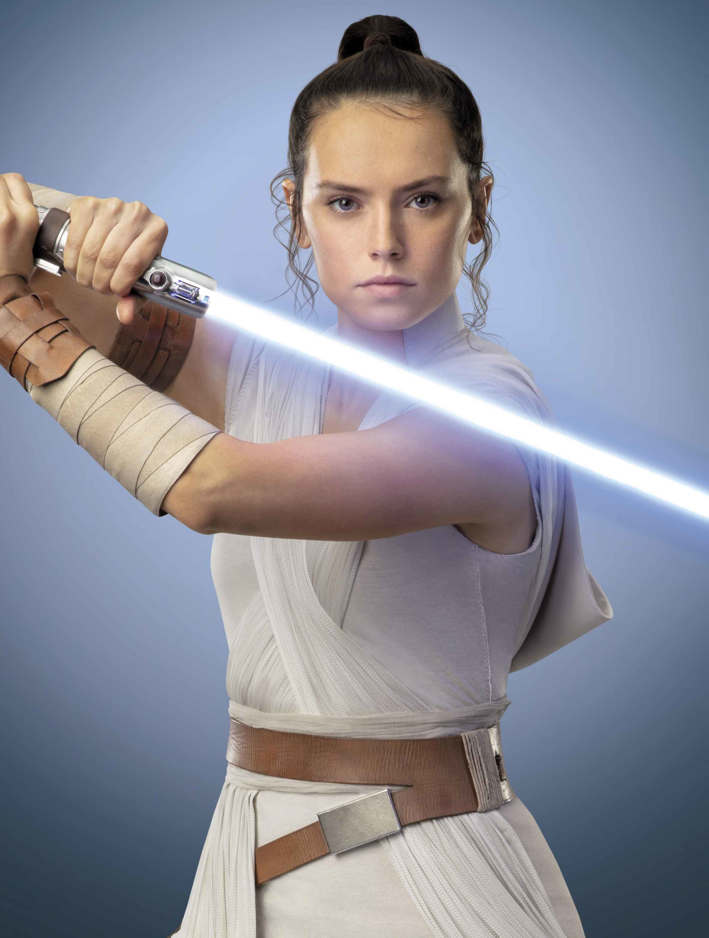 Rey wields the lightsaber of Anakin and Luke Skywalker as her own.