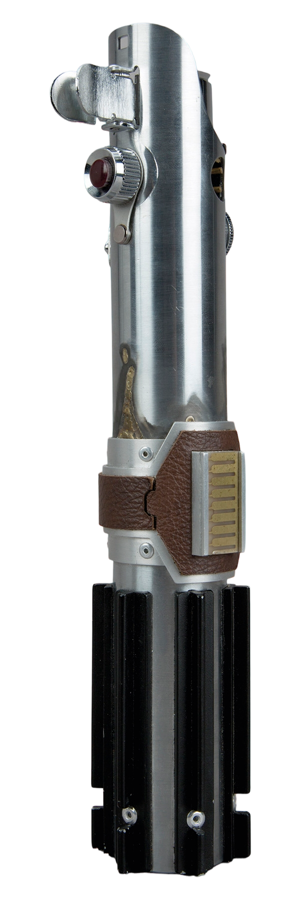 The original hilt carried by Mark Hamill in A New Hope was made from the flash attachment of a Graflex 3 cell flash unit, a flash tube attachment used on forties-era press cameras, with the ridged grips made by gluing portions of hard plastic T-track used for cabinet sliding doors (often mistaken for wiper blades) onto the bare cylinder, and the switch plate fashioned from the LED display of an Exactra 19 or 20 calculator. A D-ring assembly was also added to the bottom.[84] The lightsaber used in The Empire Strikes Back was again based on a Graflex, but the 'T' tracks were instead screwed on and were only 6 instead of 7, the switch plate was replaced with part of a circuit board, the Graflex logo was covered with mylar tape, and part of a Kobold camera flash was used to create the D-ring assembly.[85]