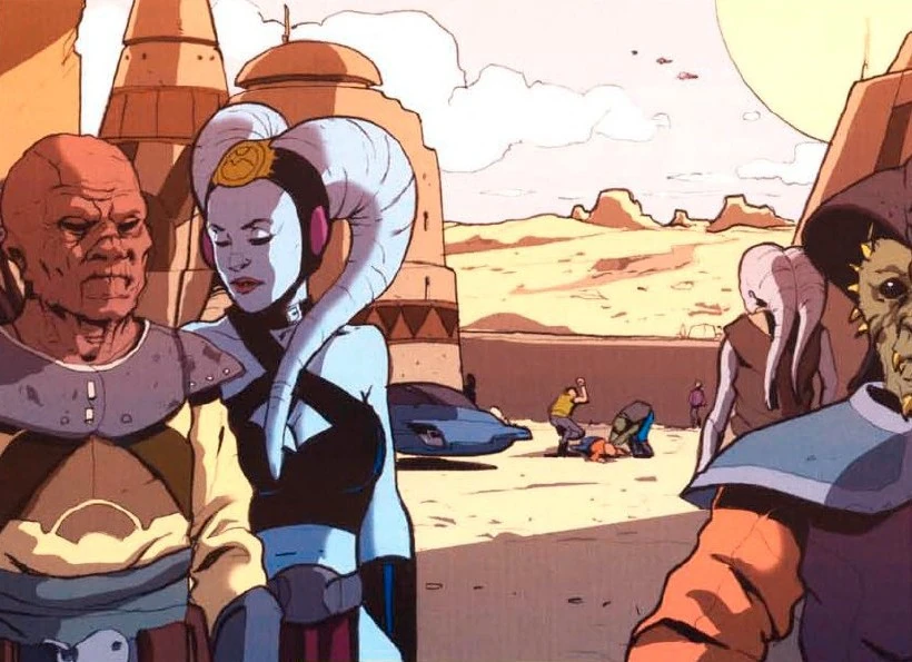 Sriluur was also home to a sizable population of Houk, a humanoid species that was noted for its great physical strength. A guiding principle in Houk culture was seeing violence as the preferable means to solve a conflict,[7] which meant that they often found themselves at odds with the Weequay. Many Humans, Hutts, Nimbanels, and Toydarians were also present, though in far lesser numbers than the Houk.[1]