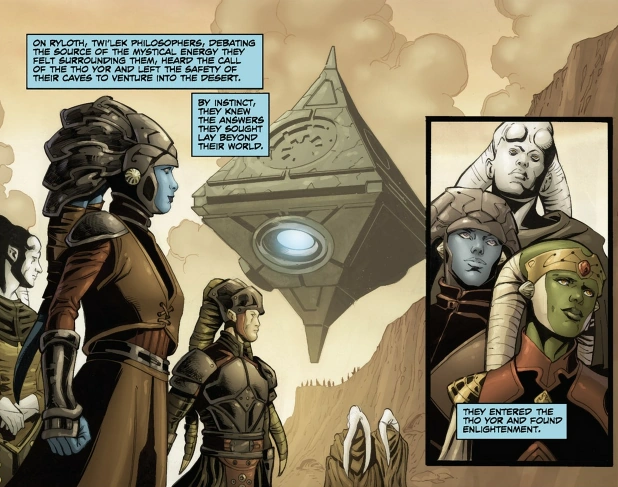 In the year 36,453 BBY, the Talid monks of the Order of Dai Bendu on the planet Ando Prime feel the call of the Tho Yor, a massive pyramidal starship that has been buried in the Andobi Mountains for centuries. The Dai Bendu monks board the Tho Yor as seven other Tho Yor across the galaxy call out to the natives of the planets upon which they rest; the Tho Yor then travel the galaxy and visit other planets, gathering Wookiees, Humans, Twi'leks, Selkath, Cathar, and a number of other Force-sensitive species, before all eight travel to the planet Tython in the Deep Core. There, the eight Tho Yor gather around the ninth and largest Tho Yor, which floats above a pinnacle of stone, and the starships scatter themselves across Tython as the planet is engulfed in a ferocious Force Storm.[2]