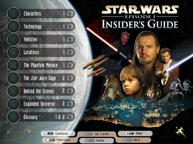 The Star Wars Episode I Insider's Guide was a computer program released on CD-ROM by LucasArts in June 1999. It is a thorough guide of over 500 entries to the characters, technology, vehicles, and locations of Star Wars: Episode I The Phantom Menace. It also includes behind the scenes details, official trailers and posters of the film, additional information on the previously released films of the saga, and a guide to Expanded Universe material relating to Episode I.