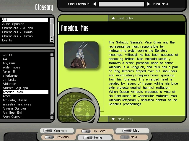 Found on both discs, the glossary is an encyclopedia-like reference source, based on selected information from the film and various spin-off materials available at the time. The list is sortable into various categories: