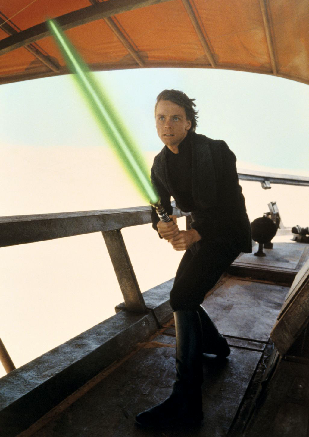 Luke and Leia defeat the remaining guards on the Sail Barge, then Luke has Leia point the guns toward the heart of the vehicle. They prepare to swing from a loose cable on the Barge's sails, and Luke discharges the guns, beginning to destroy the barge. They swing to their rescue on the land skiff with Han, Lando, and Chewbacca, then use magnets to pick up the two droids from the sand. They all drive off just as the sail barge explodes.