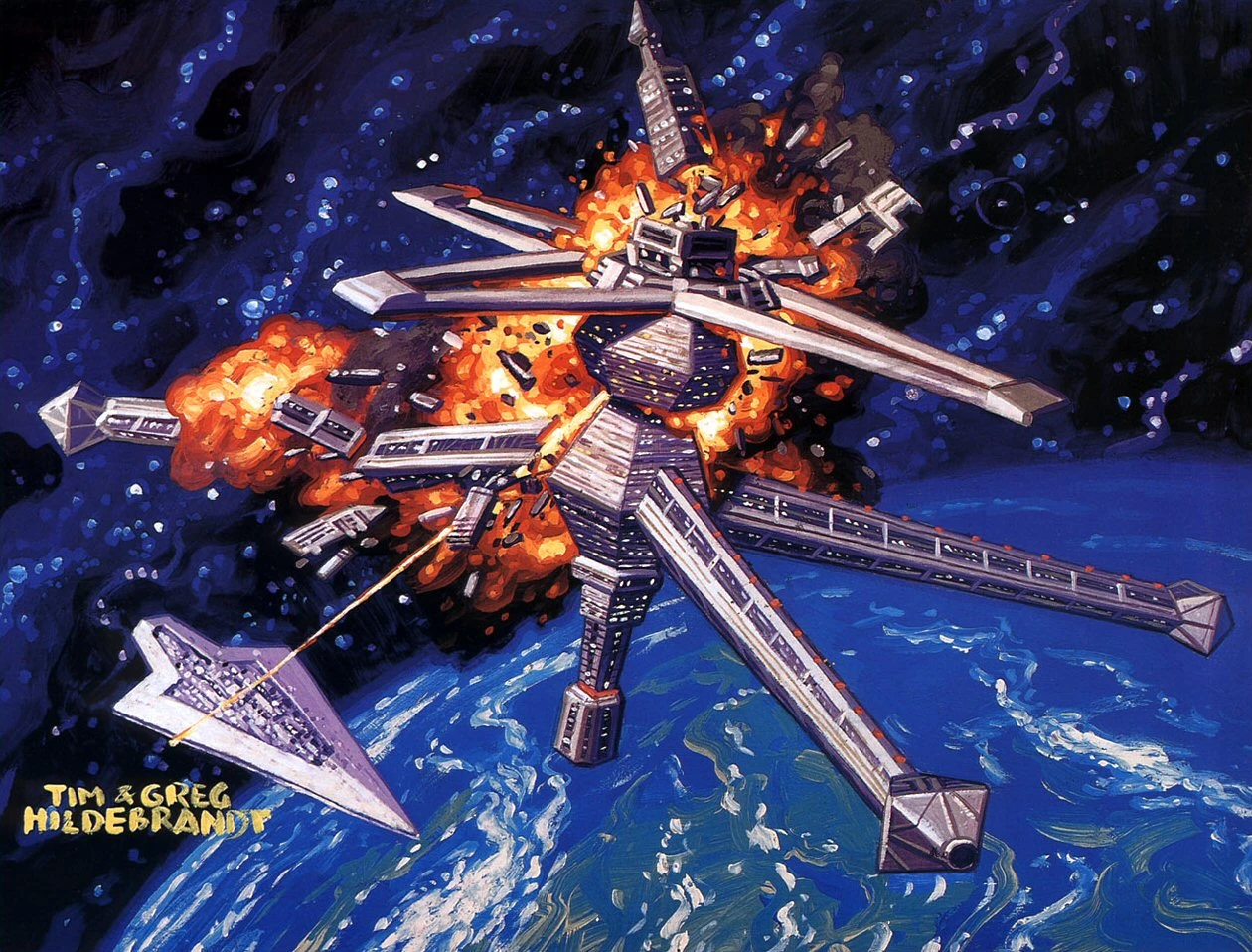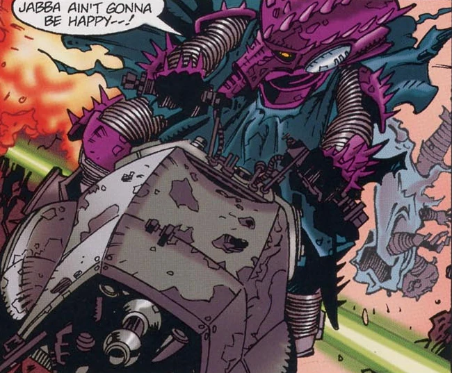The Slave I carrying Han Solo in carbonite block, exits hyperspace above Tatooine and Boba Fett hopes to deliver it to Jabba; but discovers that a signal beacon -installed when he was on Cloud City- was activated. The IG-2000 arrives and he has a dangerous encounter with IG-88D, who intends to claim the bounty of Solo. Slave I sustains some damage but Fett outwits the droid. Thinking that it is destroyed, Fett retreats to planet Gall for repairs; but the droid also managed to survive and limps off to Ord Mantell to search for spare parts for the ship in the planet's scrapyard.