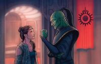 On Coruscant, having just ended the relationship with his mistress, and dined at Menarai, he sends Guri to Ororo Transportation, a rival to Black Sun, and arranges a second meeting with Vader.