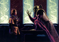 On Coruscant, Xizor is in a meeting of Black Sun "Vigos." Several agents are present: Durga, Kreet'ah, Clezo, Wumdi, Perit, and Green. Knowing Green's ambitions and network of double agents, Guri strangles him in order to intimidate other ambitious Vigos and make a point that Xizor does not tolerate such cooperatives. When the meeting is concluded, Xizor summons Jabba to meet him.