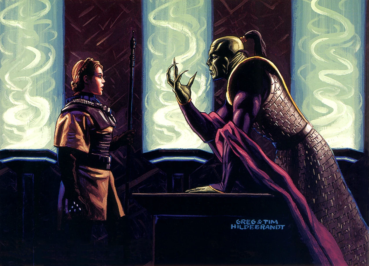 Leia Organa meets Prince Xizor, depicted by the Hildebrandts.