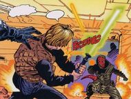 Meanwhile, Lando wanted to redeem himself of his treachery and had sent Rendar to discover traces of Han Solo. Having tracked IG-88 on Ord Mantell, he is sent there to learn Fett's whereabouts. IG-88D hid in a salvage plant which, as Leebo scans show, is connected with a hover train. Rendar travels from train car to train car, fighting trainyard vagrants and automated defenses along the way until he reaches one whose tracks run parallel to those of the train that lead to his destination. As the two trains move alongside each other, Rendar leaps across the gap and makes his way to the front. Leebo then manages remotely to jam the hovertrain's auto-brakes, causing it to crash and break the door of the salvage plant. Inside, Rendar finds IG-88D who reveals that he had indeed tracked Fett to the Zhar system. Unwilling to let Rendar stop him from taking Solo from Fett, the droid opens fire. Rendar fights back and defeats the droid.