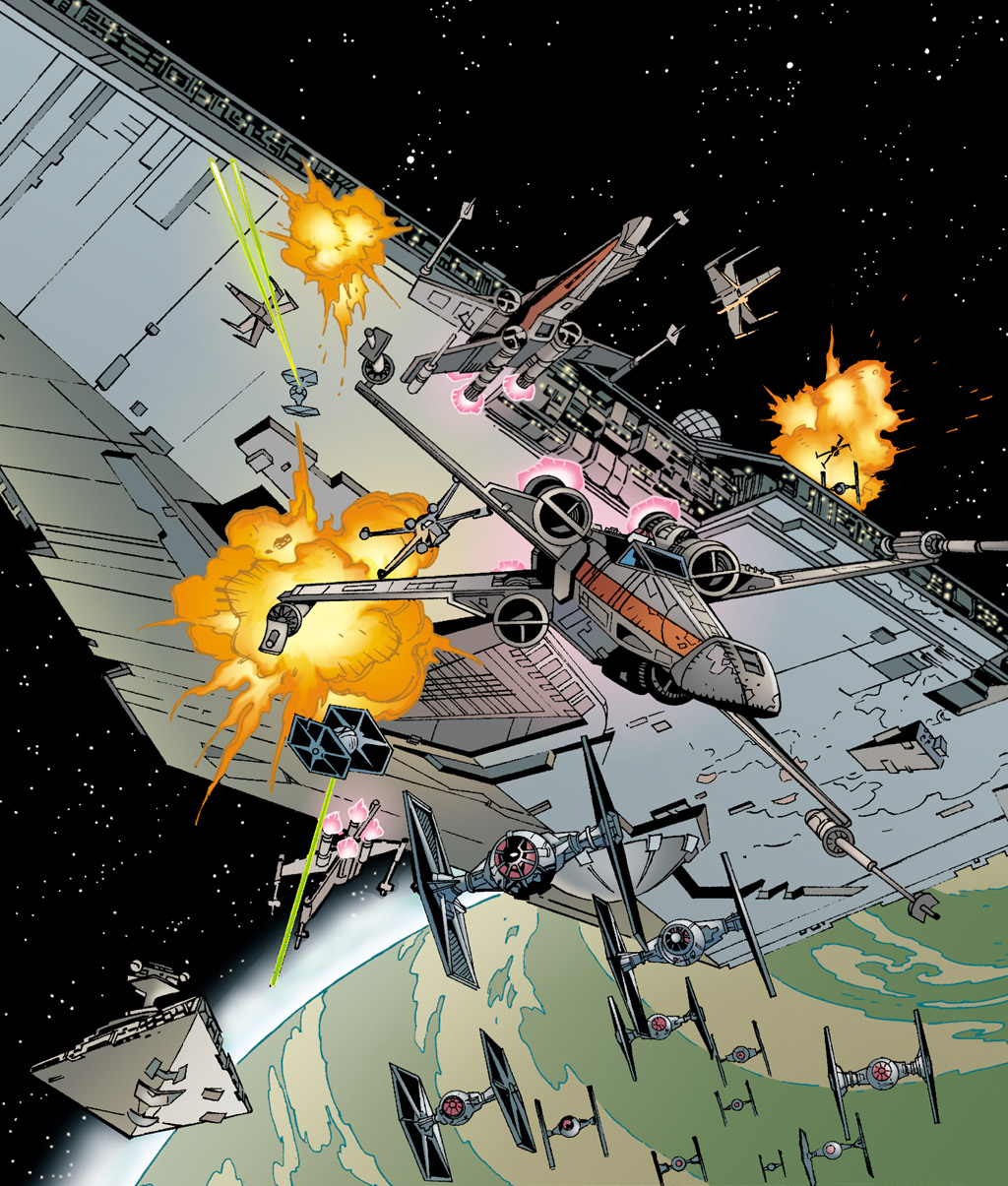 Aboard the Redemption, Leia is informed that an Imperial Strike Cruiser has spotted the fleet; Wedge Antilles leads the Rogues into a space battle so that their rendezvous point remains secret. Leia meanwhile understands that Luke is different after his encounter with Darth Vader and wonders what happened between them.