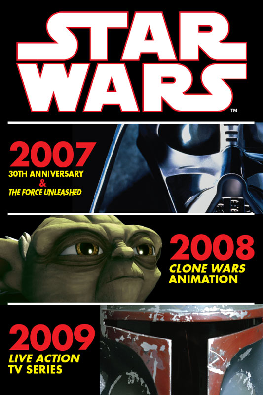 In a 2006 interview, Steve Sansweet said that he expected the series to be released "toward the end of the decade." He gave the time period until release to be "about 3 years."[119] A teaser image for the series was shown at Toy Fair 2007, advertising the next three years of Star Wars: the 30th anniversary of the saga and the release of The Force Unleashed in 2007 (which was ultimately pushed back to 2008), the new Clone Wars TV series in 2008, and the live-action series in 2009.[120][121][122][123] Rick McCallum expected the series to be released simultaneously worldwide and to be broadcast on cable.[39][40] Both Disney and News Corp were rumored to have shown interest in acquiring broadcast rights for the show, with the former offering ABC and ABC Family and the latter offering FOX and FX.[124] Additionally, Lucas voiced his interest in distributing the series via the Internet—specifically StarWars.com.[125]