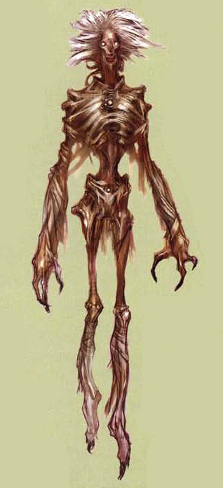 Starweirds were an ancient species of semi-corporeal spirits that resonated with the Force and were considered a great and terrible power. Tall, thin, almost skeletal in appearance, and with pale skin, Starweirds had blazing eyes, long white hair, long arms that ended in three-fingered sharp claws, and long legs. Overall, they were regarded as a terrifying species.