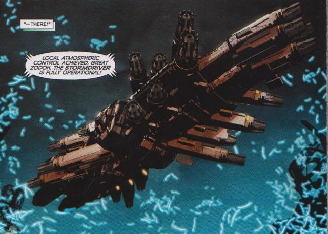 During the Battle of Capital Cay in 1032 BBY, one Stormdriver was used to wreak havoc on Daiman's defense forces by creating atmospheric storms and floods which swept them into the sea. However, this vessel was destroyed by starfighters from Grace Command's Devil Squadron, an Alderaanian-based mercy organization affiliated with the Galactic Republic. Despite this, Zodoh gained enough data on Aquilaris' atmospheric systems to launch the next phase of the Aquilaris campaign. This involved using a fleet of Stormdrivers to vaporize all mositure from Aquilaris' atmosphere and then create atmospheric storms which would flood the entire planet. Zodoh intended to use this new superweapon to browbeat his Sith competitors, particularly Sith Lord Daiman, into submission.