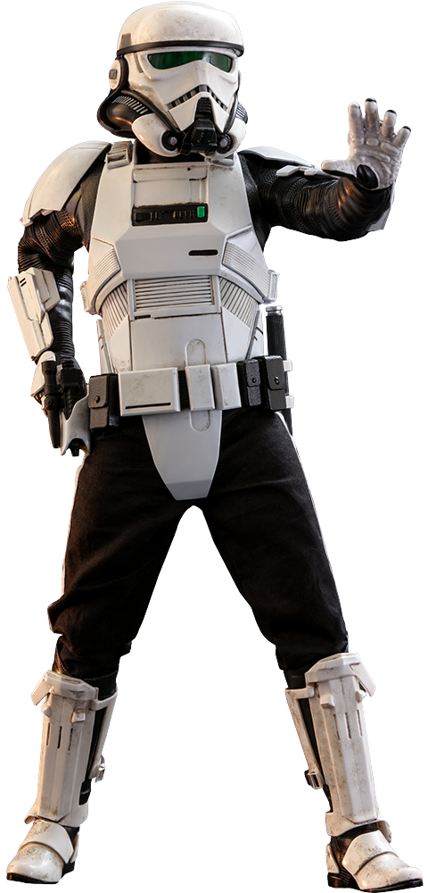 - Heavy Weapons Stormtroopers: Specialized stormtroopers that wielded large rotary blaster cannons and were equipped with black pauldrons. There were also heavy sandtroopers for desert operations, heavy shoretroopers for coastal and tropical regions, and heavy snowtroopers for cold weather environments.[145] Heavy snowtroopers were sometimes also equipped with small black pauldrons.[79]