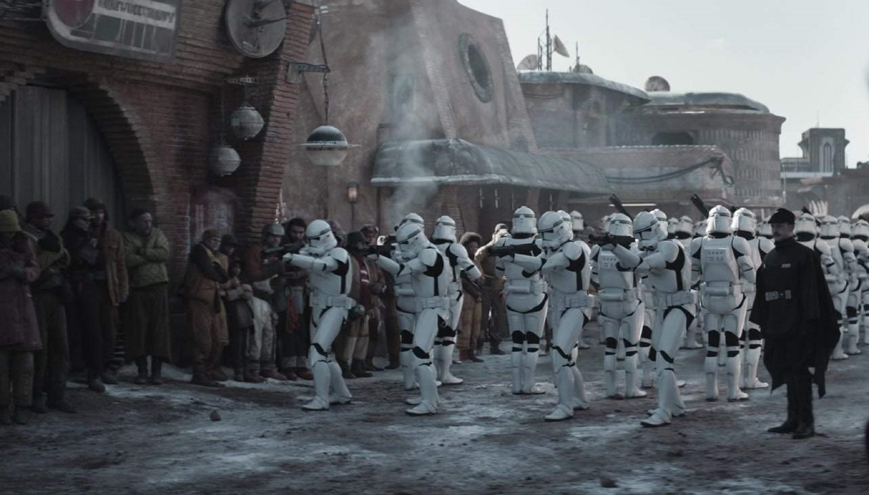 When Djarin returned to Nevarro with his allies to kill the Client, the Imperial and his personal stormtrooper guard were instead killed when Gideon ordered his personal guard of death troopers to fire into the city's cantina,[90] wiping out the entire stormtrooper squad.[95] Gideon was then reinforced by a battalion, composed mostly of pristine stormtroopers[90] from the Imperial base,[89] to recapture "the Child" from Djarin. As the battle unfolded, mercenary and pristine stormtroopers would fight side-by-side against the Mandalorian and his allies, who were forced into the sewers. Nevertheless, they ultimately triumphed over the stormtroopers, but their victory came at the cost of the Ugnaught Kuiil and IG-series assassin droid IG-11, the latter having sacrificed himself to take out a stormtrooper platoon.[95]