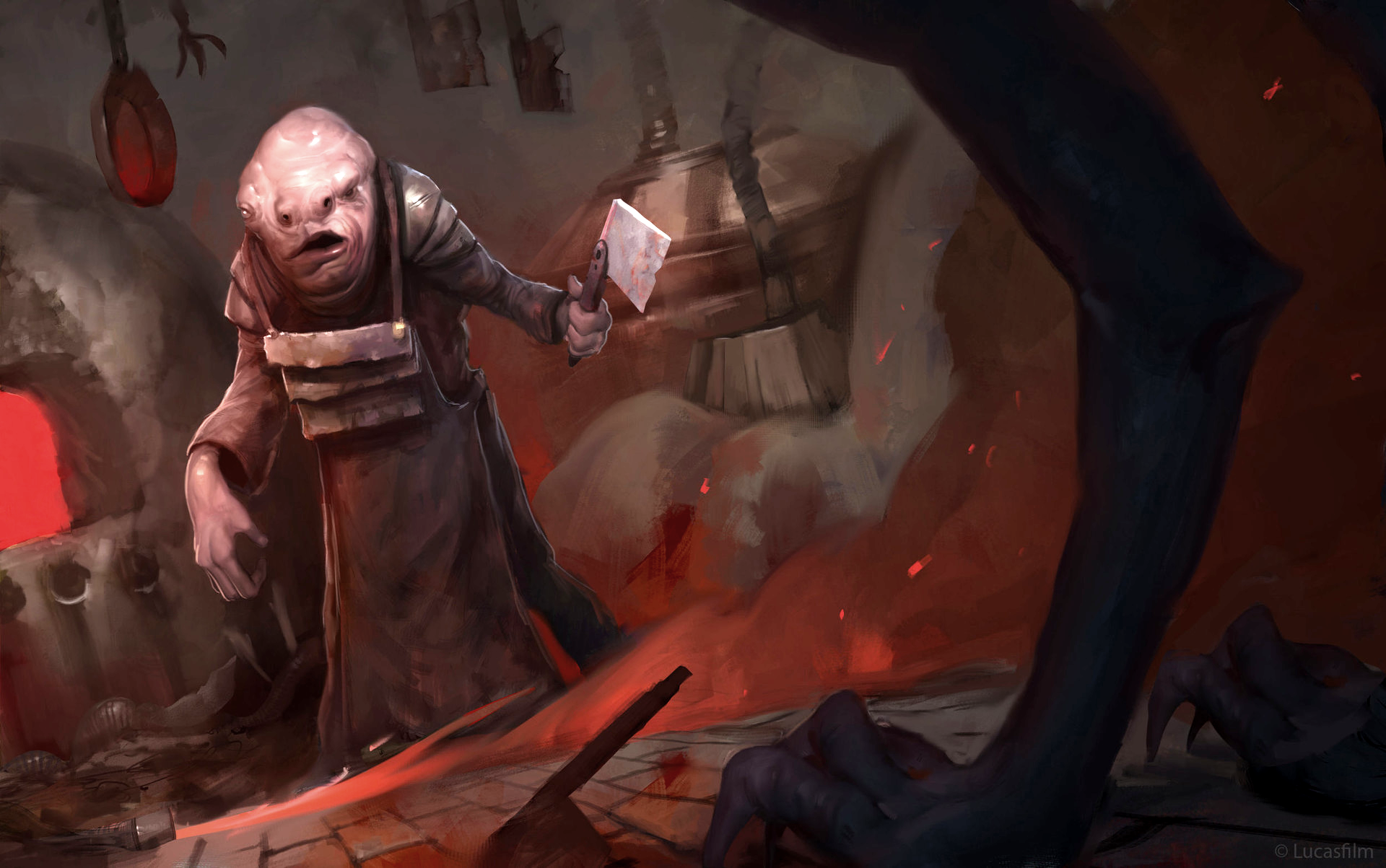 Over the next few hours, Tuggs convinced the majordomo of the castle to allow him to host a cooking competition to find his next sous chef, offering to broadcast the event to the whole castle to keep the residents calm during an incoming storm. He then informed his staff that one of them would be replacing Ely, who he claimed had simply mysteriously left the castle. Four cooks stepped forward to apply for the position, the Devaronian Sama Macoy, the humans Relva Jace and Damor Gregon, and the Mon Calamari/Quarren hybrid Jom Jarusch. He then had the kitchen converted into a contest floor filled with all the equipment and ingredients the competitors could need and drafted the BD-3000 luxury droids Carly and J'Nell as two extra judges who would sit with him in a lifter platform.[8]