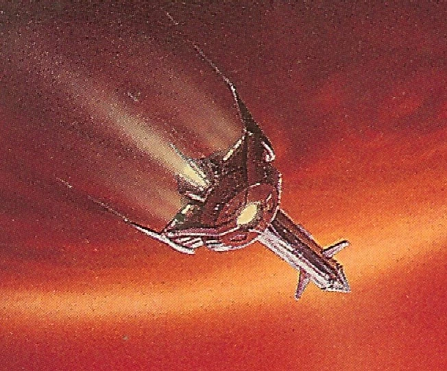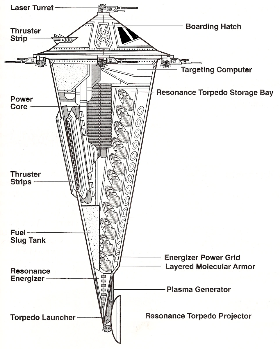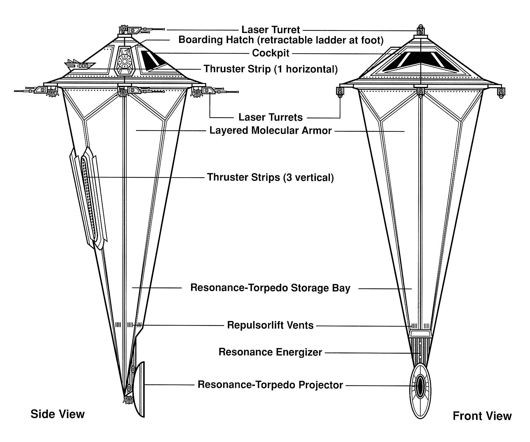 The Sun Crusher's primary weapon was a payload of 11 energy resonance torpedoes. Each torpedo resembled an oval-shaped plasma discharge and was activated when it passed through the Sun Crusher's resonance torpedo launcher. The resonance torpedo then traveled to the system's sun at near-lightspeed velocity.