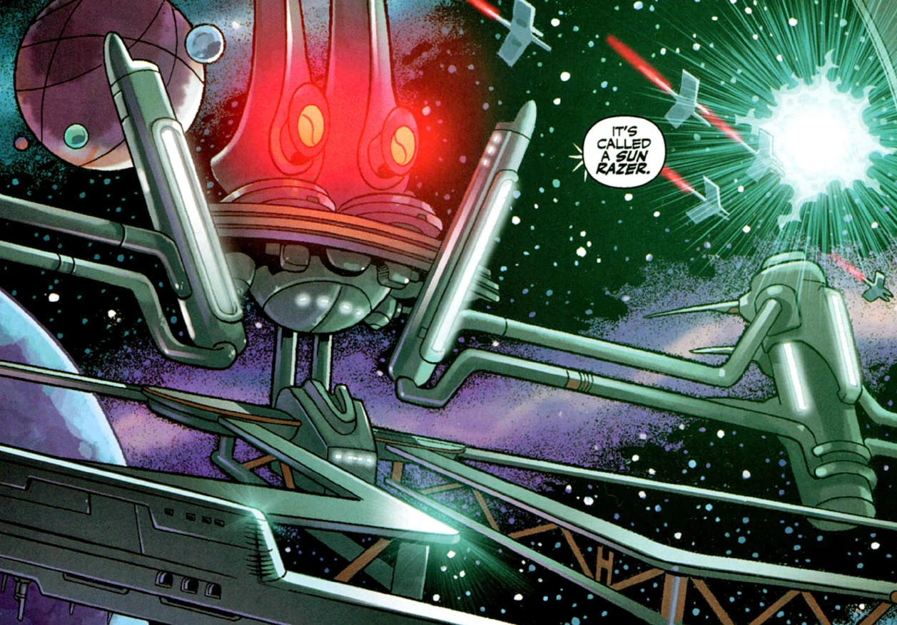 These machines were created with the capacity to encircle a star and functioned by leeching a star of matter and energy. Through its engines, it was able to provide greater resources compared to strip-mining worlds. The energy generated by this device was so great that it was capable of powering a civilization. This allowed them to create superweapons by producing enough power and materials for the task. Not every star was capable of being used by a Sun Razer, only a select few were suitable.