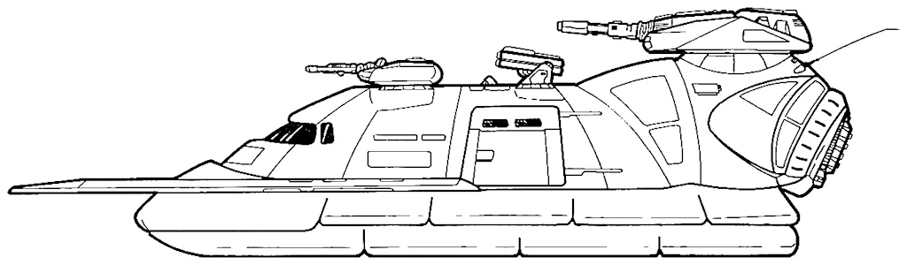Mekuun Corporation's[1] Swift Assault 5[3] was a 15.9 meter-long hovercraft.[2] It employed four Kasmin three-stage turbopumps to generate an air cushion. Kasmin's turbopumps were the most refined heavy-duty air blower of its type available, permitting the Swift Assault 5 to produce extra elevation and float when required. A Gurian S87 "perpetual charge" power plant dynamo provided power for the hoverscout; a power capacitor started the air blower rotation, and the energy generated by the vehicles air cushion was recycled via back-blast impellers to supplement the S87's power generation. The efficient engine design gave the Swift Assault 5 a longer operational range than equivalent vehicles of its size and type.[1]
