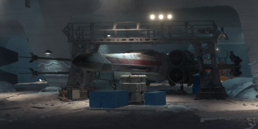 An X-wing starfighter receiving repairs in Echo Base