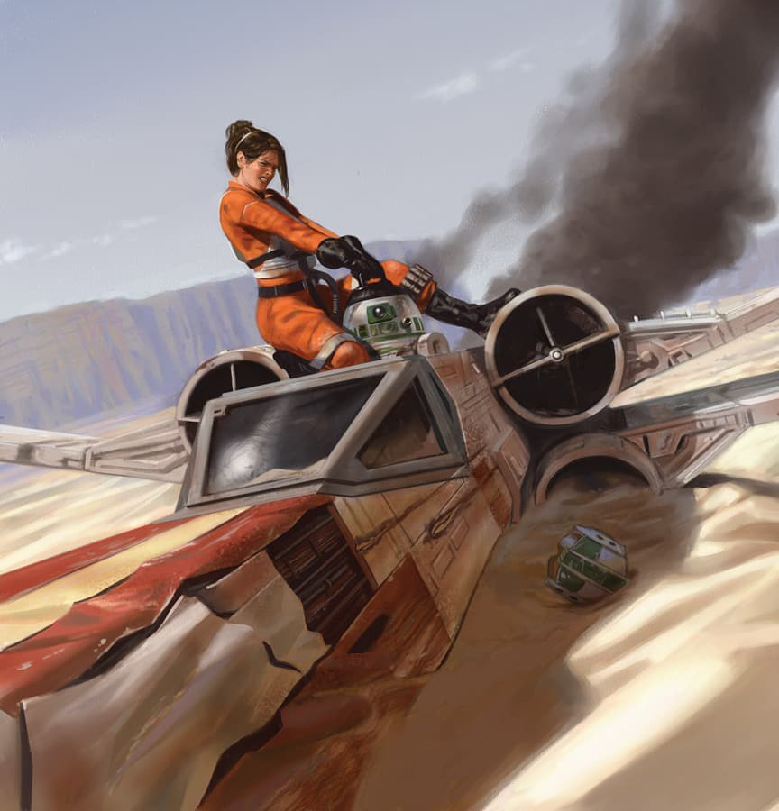 A Rebel pilot works to remove her astromech from her crashed X-wing.