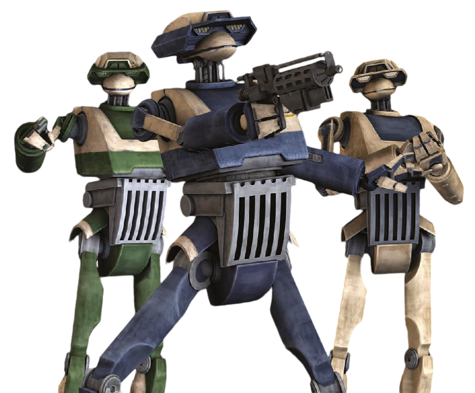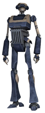 T-series tactical droids,[1] also referred to as T-1s,[14] were humanoid fourth class tactical droids standing at a height of 1.93 meters tall.[15] They were manufactured by Baktoid Combat Automata, the company that also developed the B1-series battle droid, among a host of other droids specialized in warfare. Compared to the standard B1s who served under them, they were boxier in appearance and often sported varying color schemes.[16] However, despite the T-1s often receiving individualized color schemes and even their own voices, they were more or less the same unit at heart.[17]