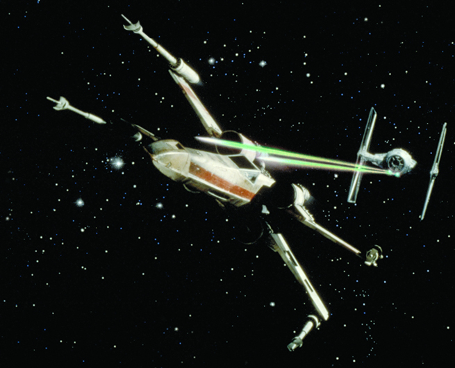 A T-65 X-wing being fired on by a TIE fighter