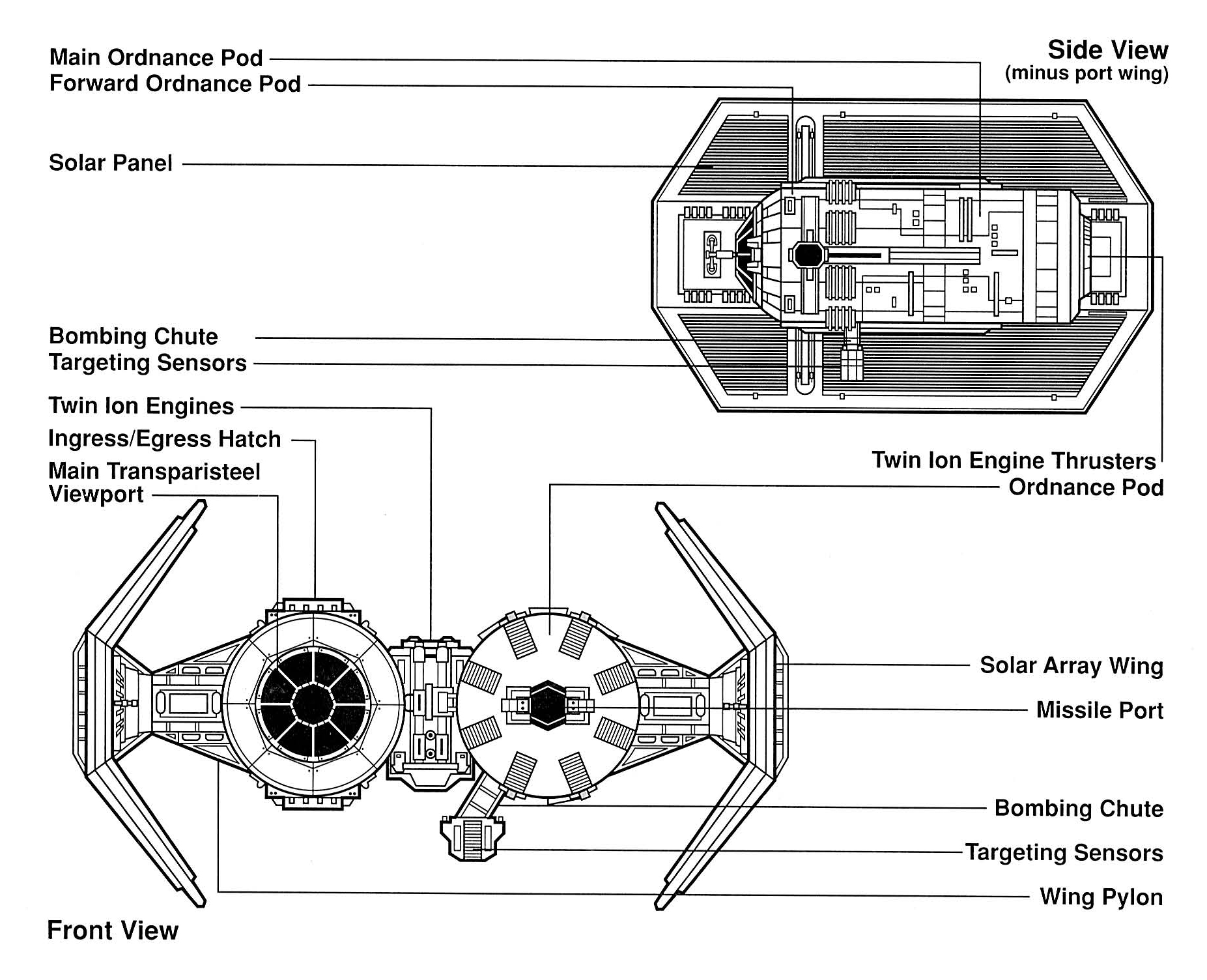 The TIE/sa bomber had two hulls next to each other; the starboard hull carried the pilot, and the port carried a pair of general-purpose warhead launchers, enabling them to carry a variety of weapons tailored for the mission. The bomber was much more heavily built up than the "fighter" series of TIEs; it carried more sophisticated sensors to penetrate capital ship jamming and SFS P-s4 twin ion engines powered by a SFS I-a2b solar ionization reactor to allow a full payload to be carried at a reasonable speed. The ordnance hull could also be swapped for a passenger cabin instead of heavy weapons.