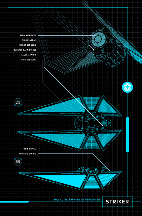 - "A design that emerged from the Empire's Scarif think tank, the TIE striker was built for atmospheric patrols over ground-based installations. While never a favorite of the Admiralty, forward-thinking commanders came to appreciate the TIE striker's combination of speed and armament, leading to a steady stream of orders from shipyards such as Corellia's."