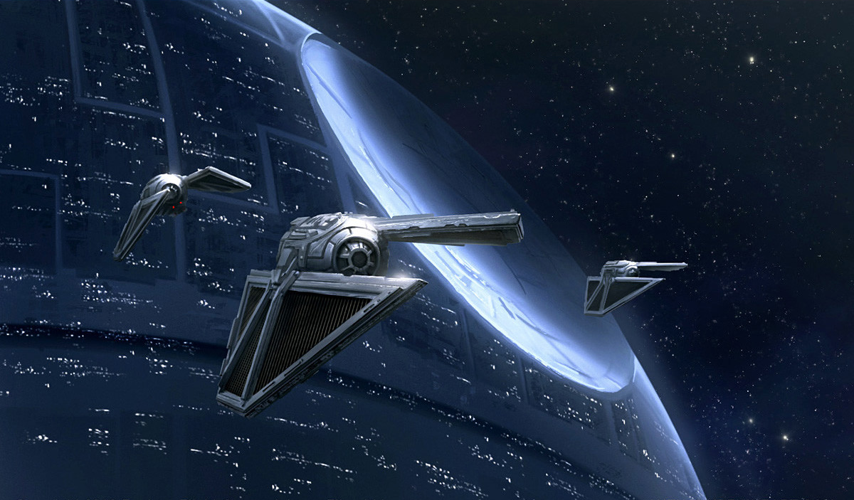 A trio of Imperial cadets perform a fly-by of the Death Star.