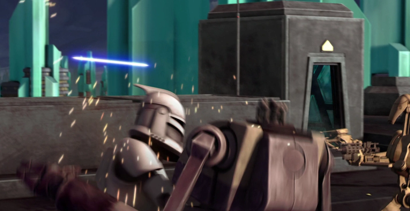 Consequently, by the time the tactical droid led its forces to the towers, it was well aware of the presence of Republic troops. It commanded its B1-Series battle droid forces from its Armored Assault Tank and surprised the Jedi and clones by splitting its troops, thus bypassing the ambush. Battle droids then attacked the south-facing tower, where Kenobi was with his troopers. The droids pinned down Kenobi and his clones, but Skywalker noticed the situation from the north tower. He signaled an LAAT/i gunship for an evacuation and led his clone troopers to help Kenobi. The Republic forces were able to hold their ground but were forced to retreat with the battle droids' larger numbers. As the Jedi and remaining clones took a turbolift to the roof, where the gunship was landing for evacuation, TJ-55 left its tank and followed the Republic troopers with its droid forces.[5]