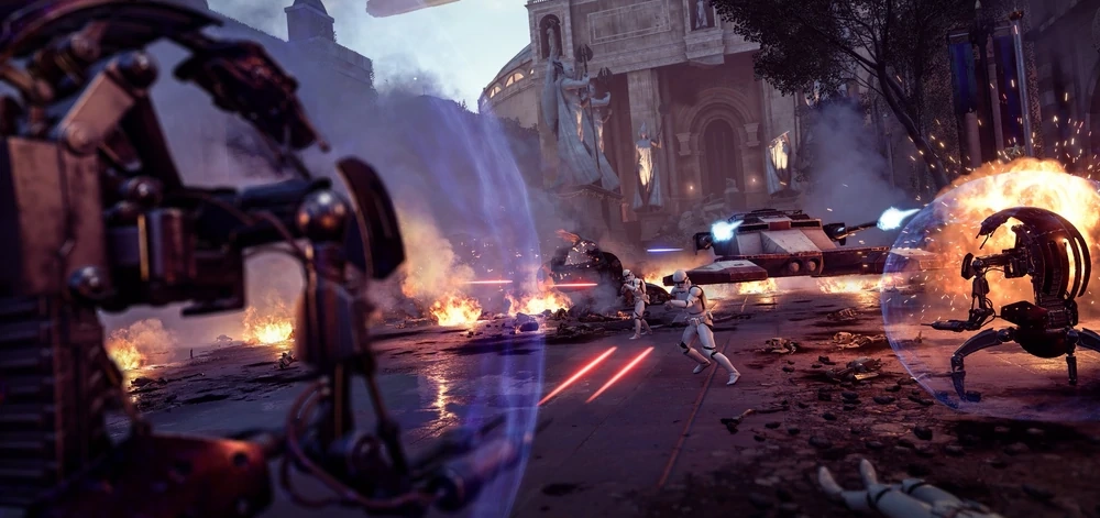Phase II clone troopers and a TX-130 engaging several droidekas in Star Wars Battlefront II