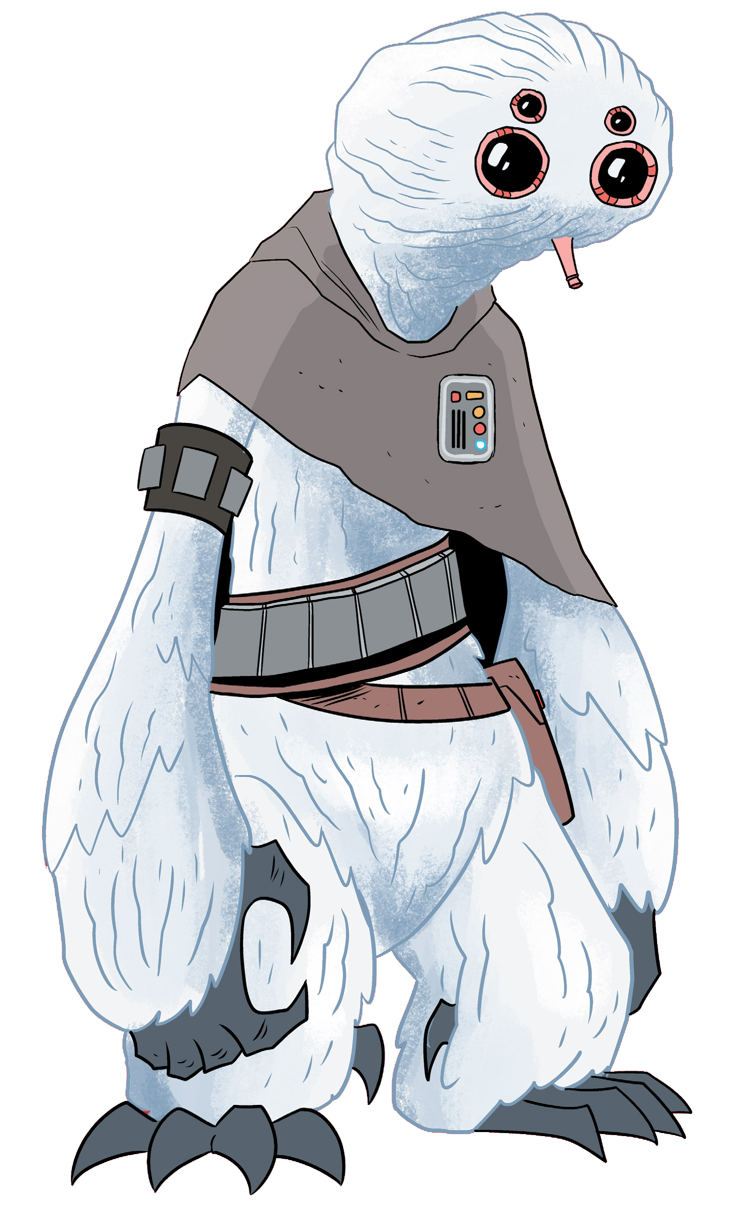 Talz were large bipeds covered in thick, shaggy white fur with sharp talons capping their five-fingered hands. They possessed four black eyes — the small eyes used for day vision and the larger eyes for night vision — and a small proboscis for feeding and communicating.[8] The shaggy fur coat protected them against the freezing conditions of their ice and snow habitat.[5]