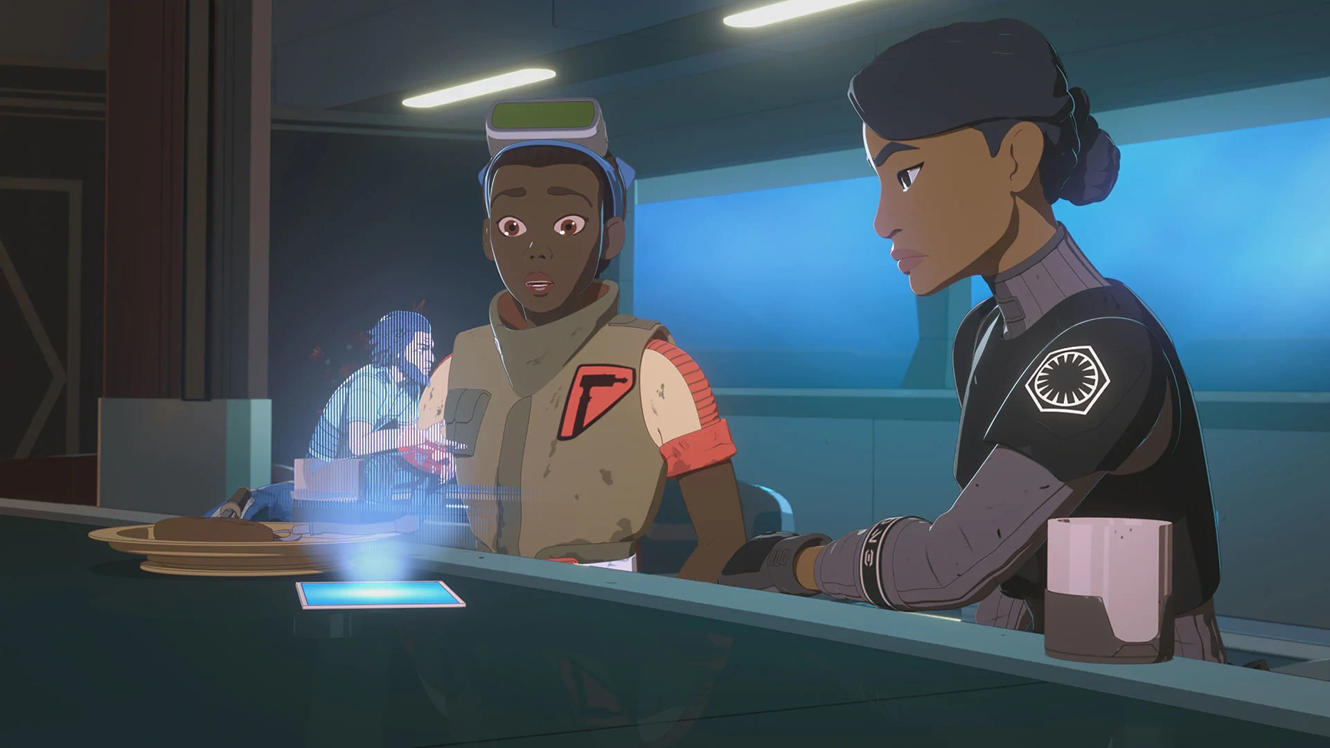 Flying over the ocean of Castilon, Rucklin recognized Kaz, Yeager, and CB-23 on an old racing ring and told the other TIEs to fire. Tam knocked him out and ordered the squadron to stand down, but they ignored her, forcing her to shoot them down. Following the dogfight, Ryvora exited her fighter and experienced an emotional reunion with Kaz and Yeager. While Kaz and Yeager were still hurt about her initial decision to join the First Order, they were delighted that she had decided to renounce the First Order and return home.[8]