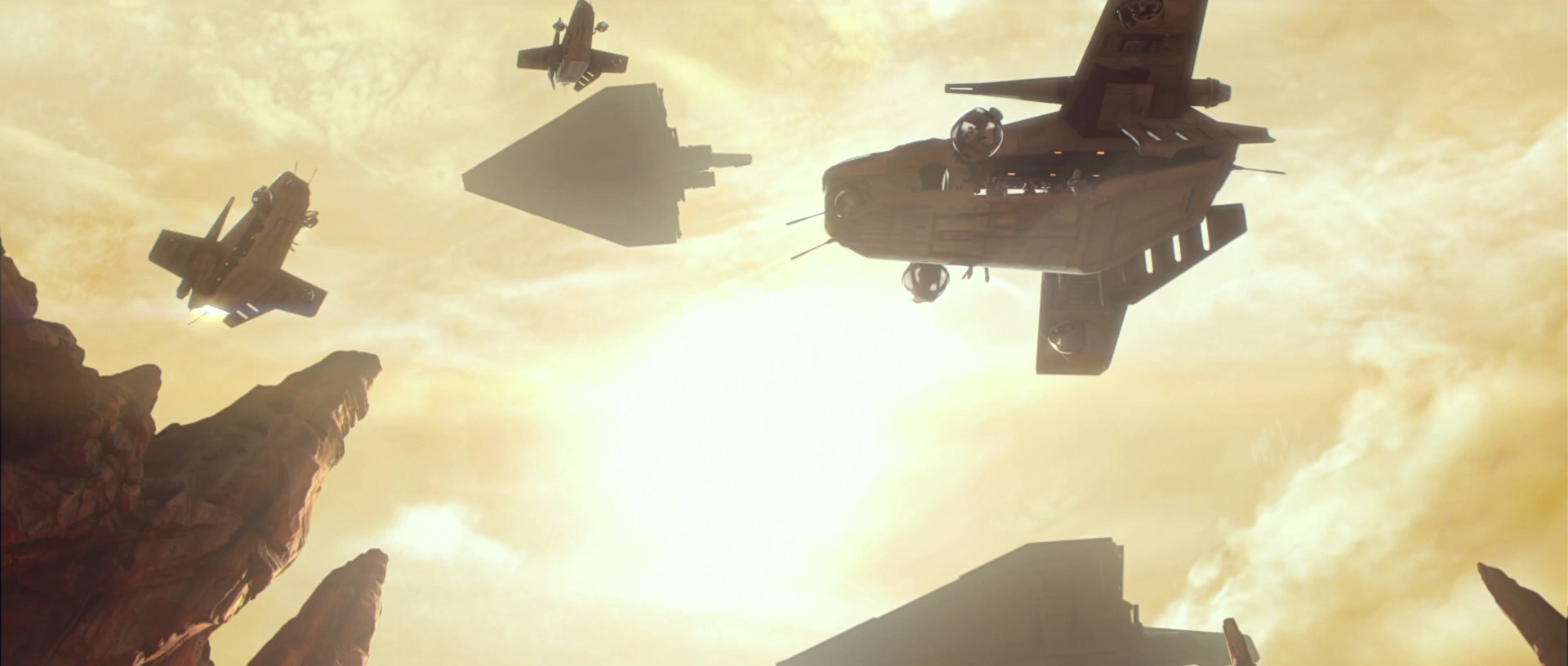 As the droids began firing, the gunships landed in a perimeter around the surviving Jedi in order to rescue them. The Jedi then boarded the ships, which left the arena and carried their occupants to join the wider battle outside. The arrival of the clones ultimately turned the battle in the Jedi and Republic's favor, allowing them to defeat the Separatist forces and force them to flee Geonosis. The battle marked the start of[2] the galaxy-wide[5] Clone Wars.[2]