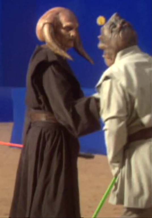 Although Gon's lightsaber is primarily shown as blue in color throughout Attack of the Clones, it is erroneously green in color during the shot in which Mace Windu refuses to surrender to Count Dooku.[2] The character's name originated in the Star Wars Legends continuity, where it was first used in the 2003 reference book Inside the Worlds of Star Wars: Attack of the Clones, written by Curtis Saxton and Simon Beecroft.[11]