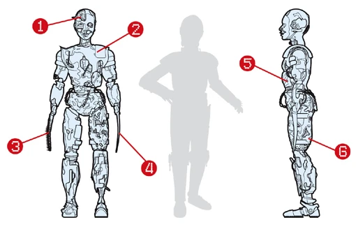 Schematic of a humanoid technobeast. (1. lobotomized brain 2. nanospore pores 3. saw blade 4. cutting blade 5. metallic tumor 6. metallic growths)