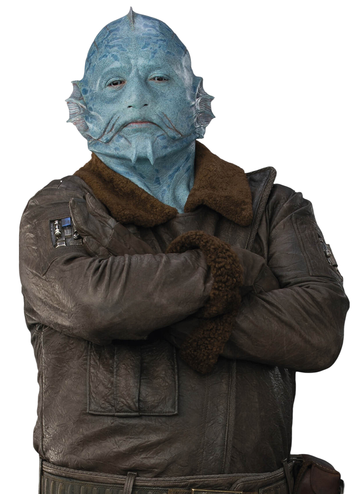 The Mythrol wore a brown jacket, as well as a pair of brown gloves, boots, and pants. He claimed to possess a sizable amount of credits, which he offered to both the trawlers and Din Djarin.[2] While taking down the last Nevarro Imperial base, he used an SE-14r light repeating blaster.[4]